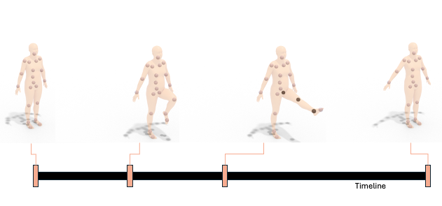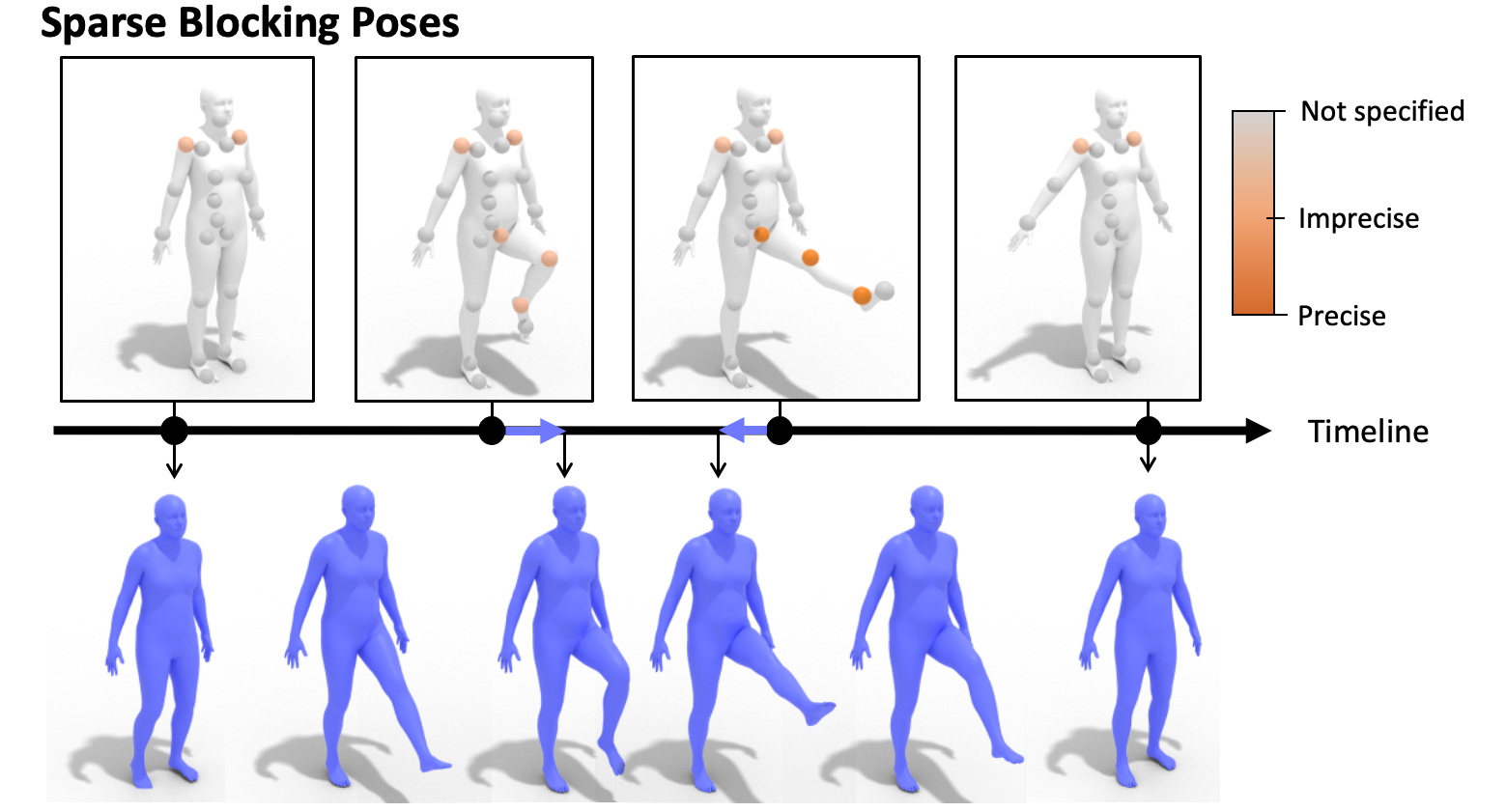 Motivation. One of the most common workflows in animation begins with motion blocking: specifying a coarse set ofposes ("blocking poses" or "keys") that convey the gist of the desired action. Blocking poses are typically few in number, imprecise in timing, and coarse or incomplete in posing. They are intended as scaffolding for future motion detailing passes where an animator fills in the details that bring the motion to life, while adjusting the timing/posing the blocking poses themsleves as necessary [Cooper 21, Lasseter 1987, Williams 2009]. Unfortunately, there is no existing diffusion technique that robustly performs motion detailing: converting blocking poses to a plausible, detailed character animation, a task that we call motion detailing. Running a standard motion-inbetweening model on blocking poses can result in unrealistic motion, because the blocking poses themselves are unrealistic.