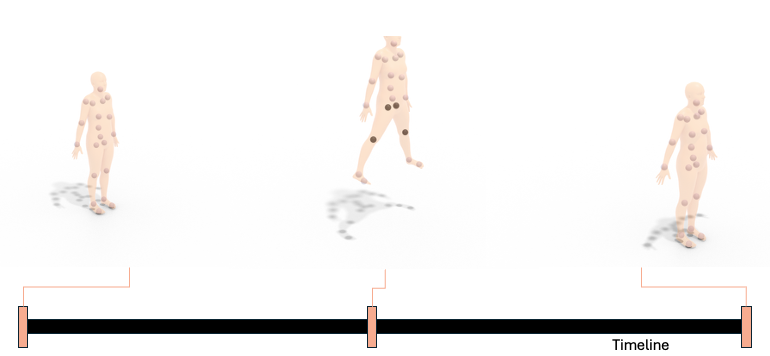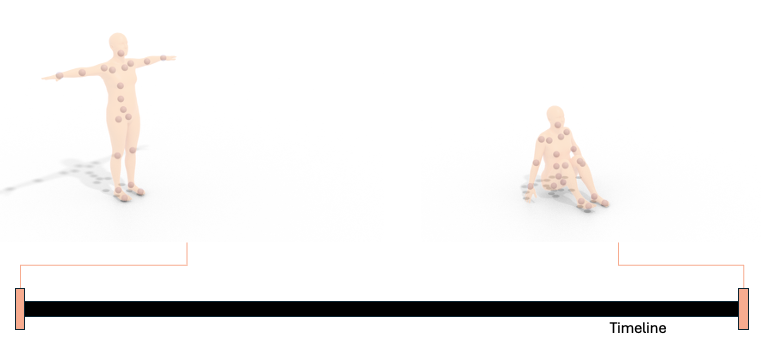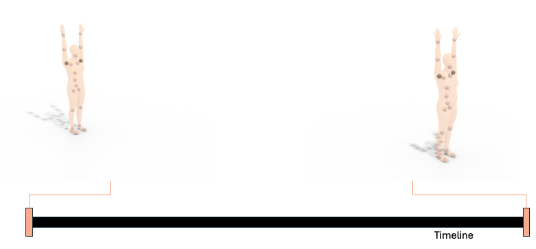 Motion inbetweening is a core task in both classical animation and modern motion generation, referring to the process of generating intermediate frames that transition smoothly between keyframes. The core problem statement is: given a sparse set of key poses placed at specific times, generate a full motion sequence that respects these poses exactly while producing natural, coherent transitions between them. This may seem like it can be used to generate motion from blocking poses, especially since blocking poses, like keyframes, are usually temporally sparse. However, motion inbetweening assumes that keyframes are well-posed and well-timed, i.e., it treats inputs as hard constraints. In contrast, blocking poses are intentionally rough: they are often underspecified, with only a handful of joints posed meaningfully, and they are placed at approximate times on the timeline. While inbetweening assumes that input poses should be preserved exactly, motion detailing requires a system to potentially refine blocking poses themselves as well as generate the in-between motion. We therefore frame motion detailing as a more general, relaxed form of motion inbetweening.Why blend the inputs of the diffusion model, not the outputs?