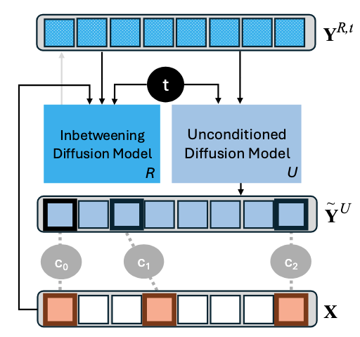 Method Summary. At certain diffusion steps, we blend the outputs of an unconditioned diffusion model (shown in light blue in the figure below) with the input blocking poses (shown in orange) based on animator-controlled per-blocking-pose tolerance weights (shown as c). We pass the blended result as an input condition to the existing retiming model (dark blue). This approach contrasts with standard blending approaches, which blend the outputs of diffusion models and rely on brittle heuristics to define per-frame blending masks. By refining the input condition, rather than model outputs, our approach allows the diffusion model to infer how each blocking pose should influence the in-between motion without requiring heuristics for setting per-frame blending masks.